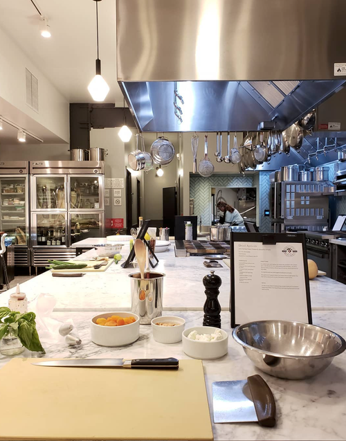 Movable custom work tables of Carrara marble and steel anchor the culinary classroom creating flexible configurations for each class or event.