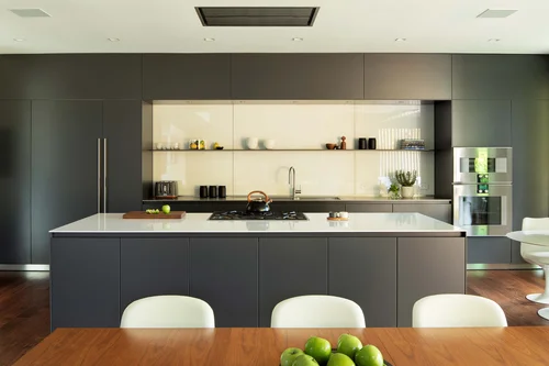 The interior detailing throughout was intentionally minimal, modern and restrained. The custom casework throughout the home was faced with American Black Walnut quarter sliced veneer with integrated pulls. The powder room and master bath have custom solid resin counters with integral sinks. In cool contrast, all of the plumbing fixtures and accessories were selected in polished chrome while the door hardware is brushed chrome.